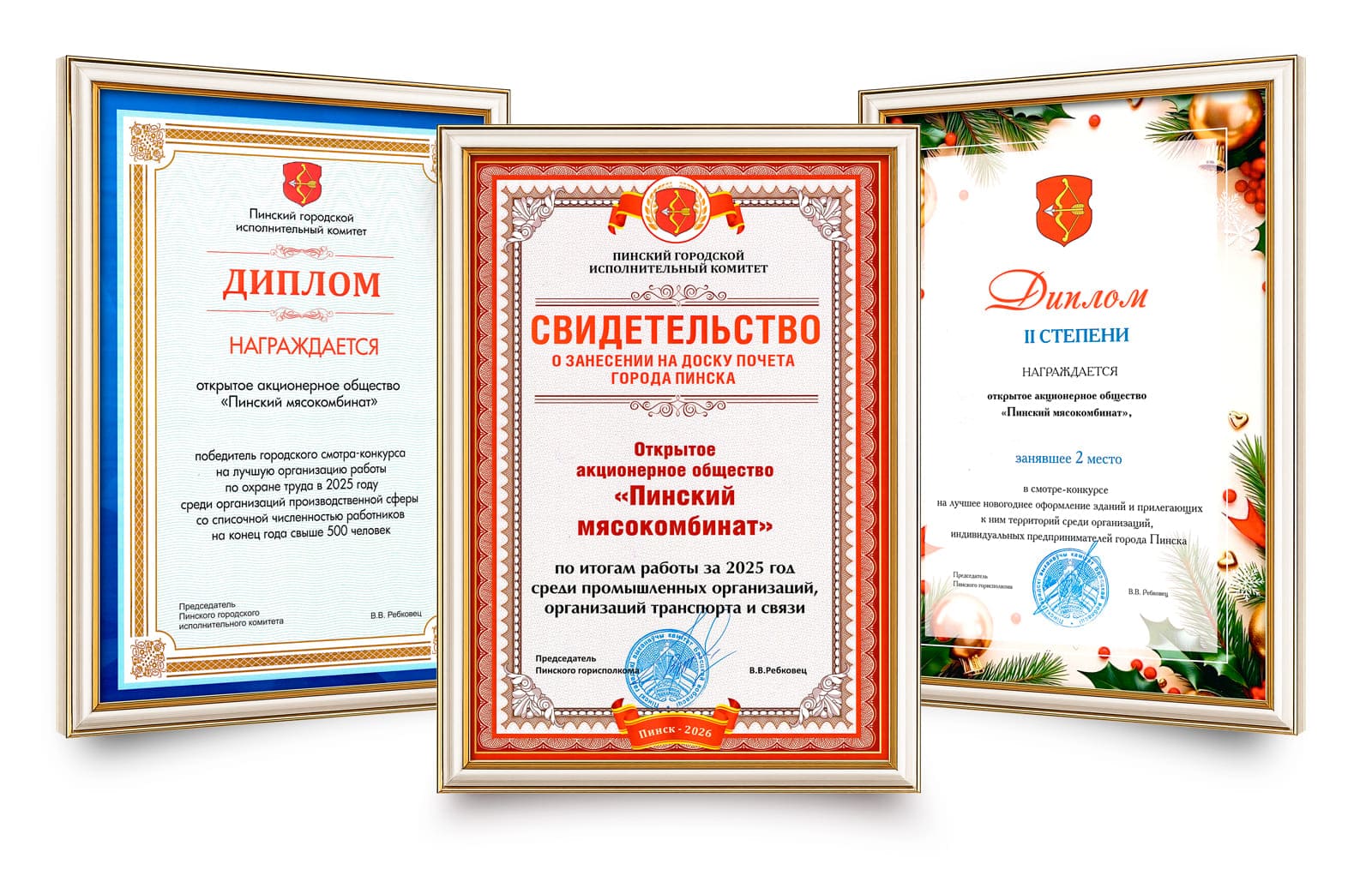Предприятие также стало победителем городского смотра‑конкурса на лучшую организацию работы по охране труда среди производственных организаций со списочной численностью свыше 500 человек. Кроме того, Пинский мясокомбинат занял второе место в конкурсе на лучшее новогоднее оформление зданий и прилегающих территорий.