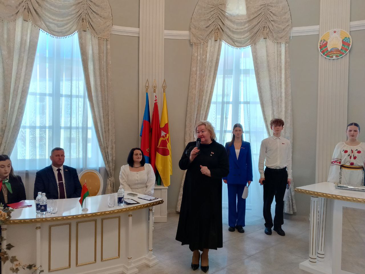 Слово для торжественного приветствия было предоставлено председателю городской организации РОО «Белая Русь» Людмиле Былинской. Затем она совместно с заместителем председателя Пинского горисполкома Николаем Новаком вручила новым членам организации членские билеты и сувениры с символикой «Белой Руси».