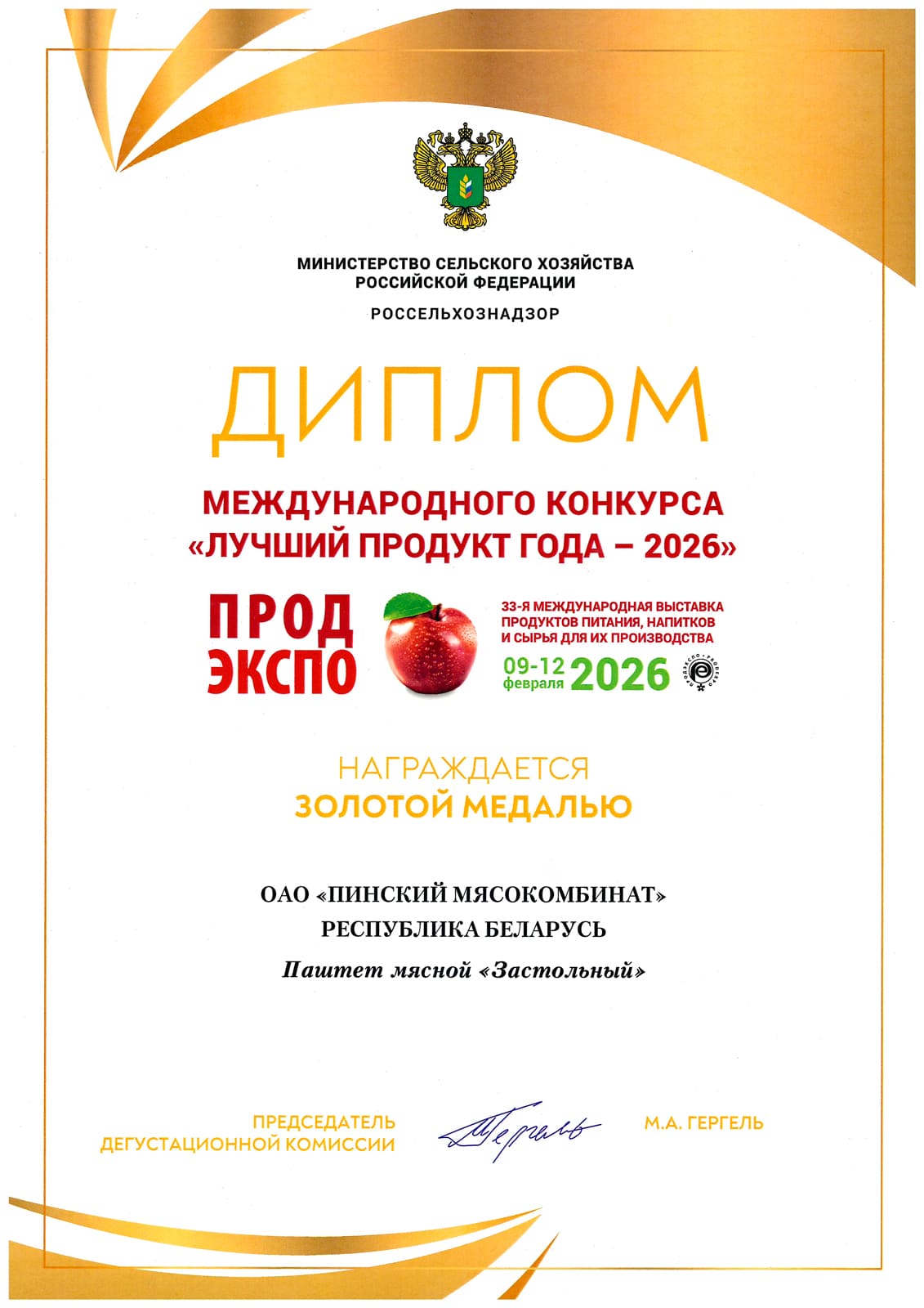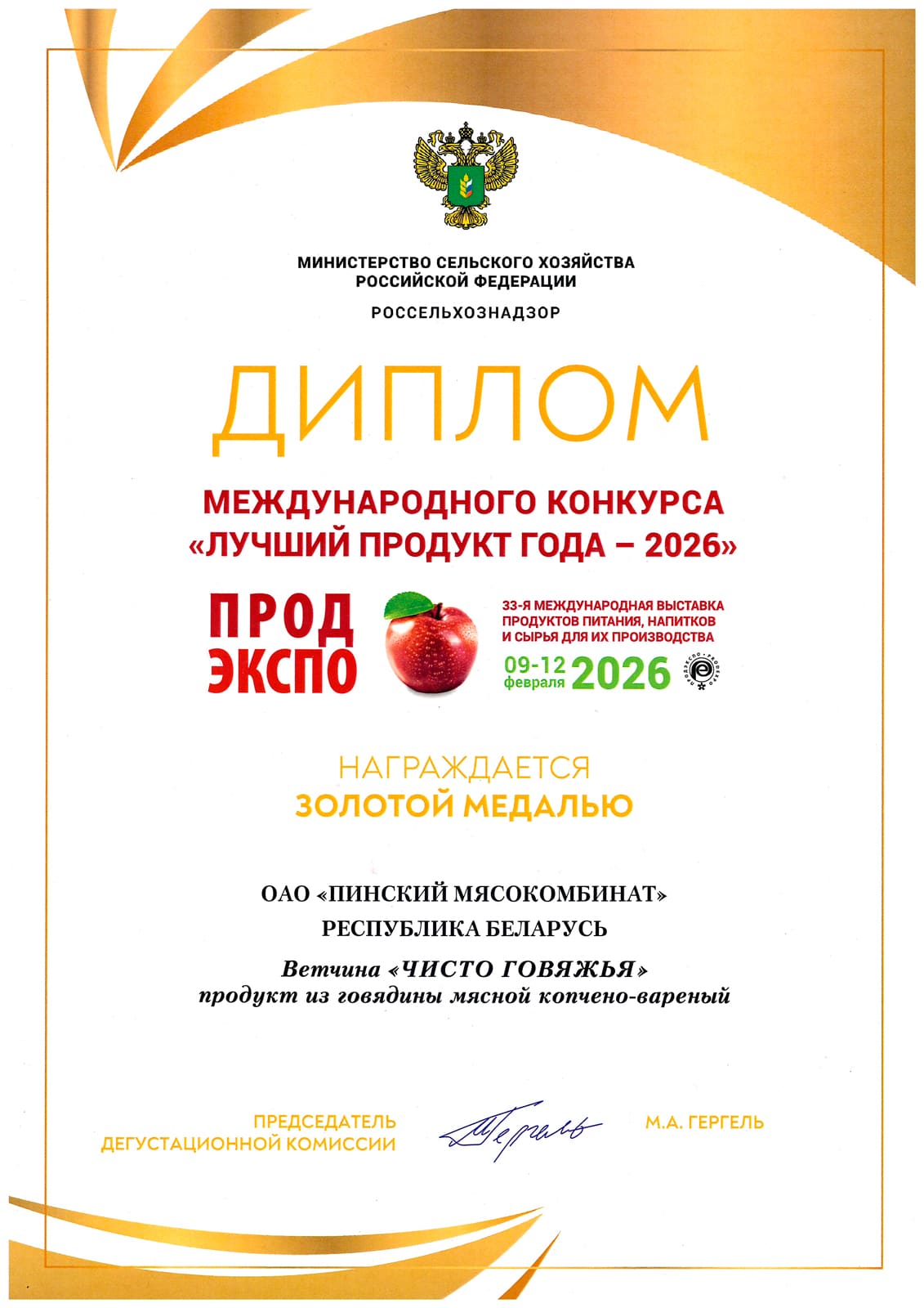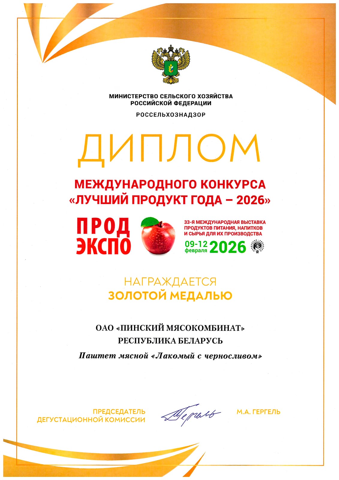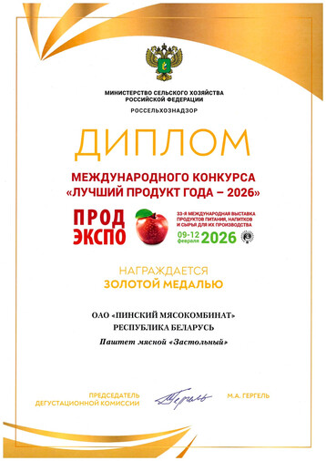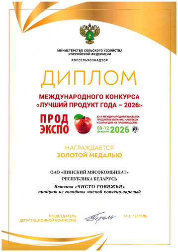 Diploma and gold medal PRODEXPO-2023, Minsk