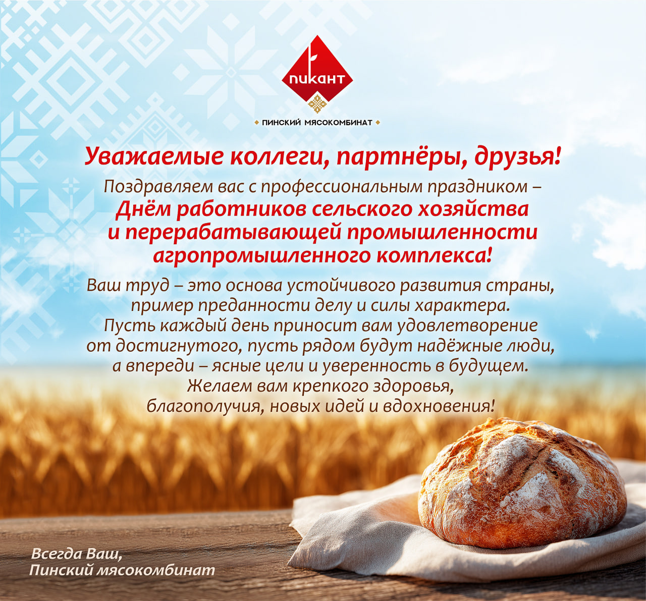 ОАО «Пинский мясокомбинат» сердечно поздравляет всех тружеников агропромышленного комплекса с профессиональным праздником –